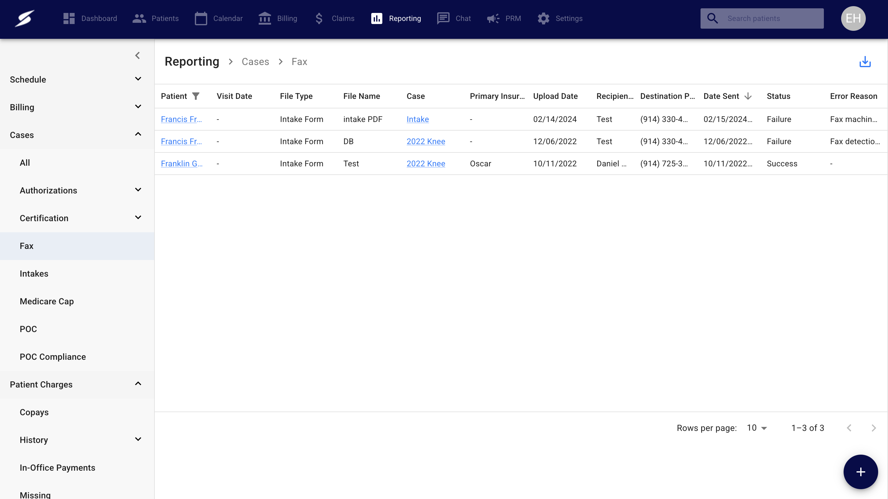 The Sent Faxes report reflects all fax history, so each time a document is sent out, a new entry will appear in the report. You can filter the report by patient name, which will show you all faxes sent out associated with that patient. The Sent Faxes will also list the visit date and file type associated with the fax, so you can see which documents have been sent and if any of the attempts have been successful. Please note: the same file will be listed several times if it has been sent out several times. Each attempt will have its own entry in the Sent Faxes report.